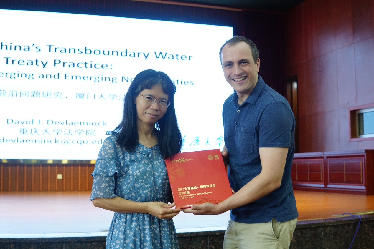 讲座伊始,陈辉萍教授简要介绍并热烈欢迎David老师,随后赠送厦门大学百年校庆纪念邮票以作留念。David老师回赠其本人已出版专著,并对厦大法学院的邀请表示诚挚谢意。
