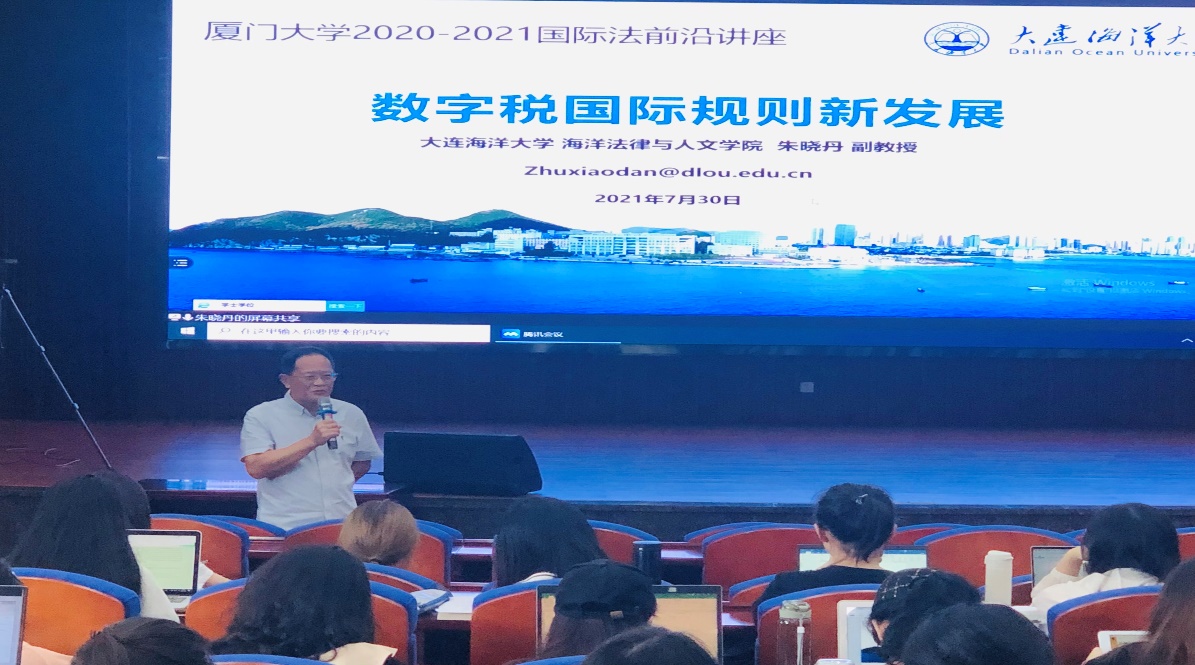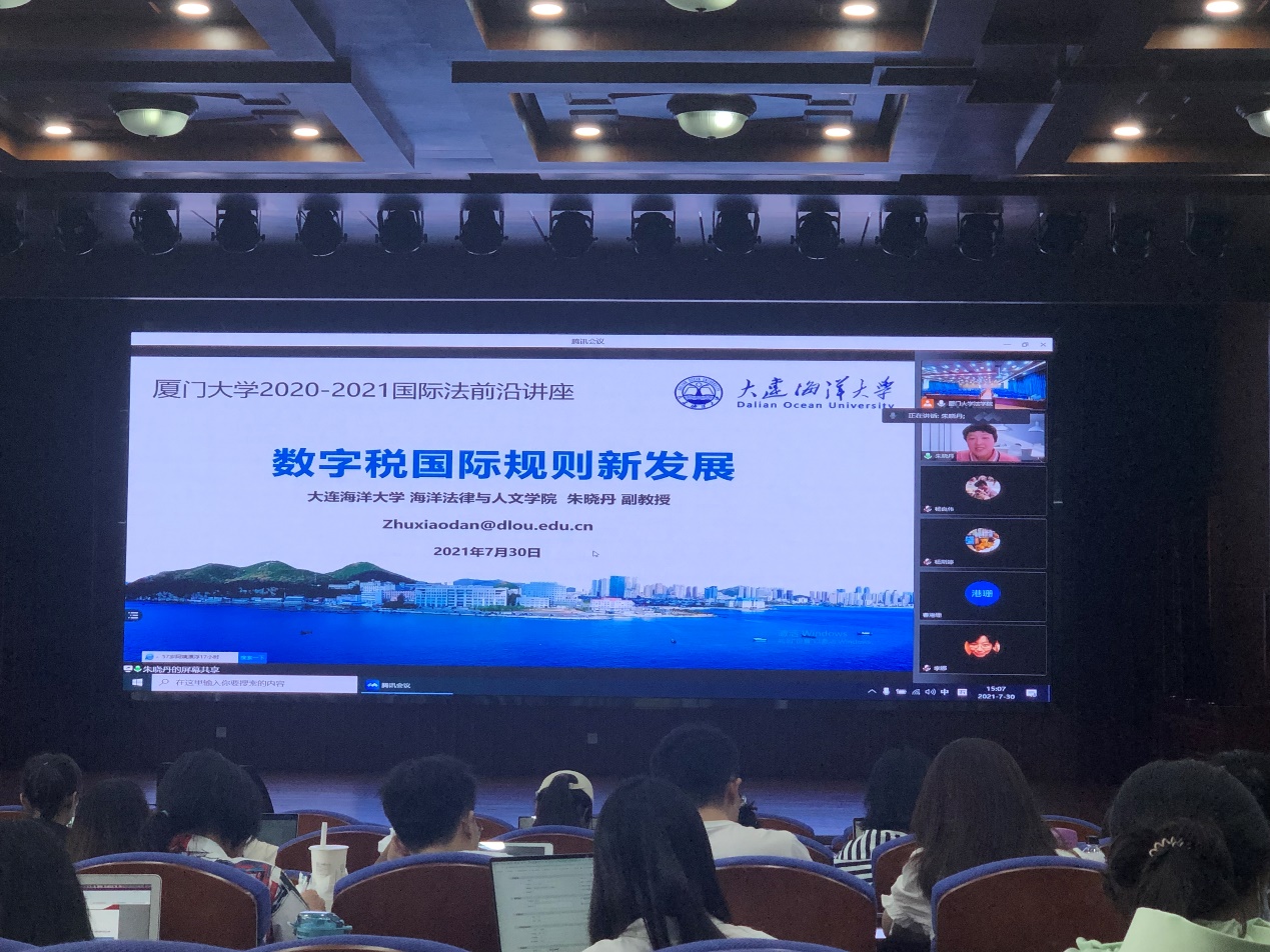 7月30日下午,第二届厦门大学国际法校友论坛最后一讲在模拟法庭顺利举行。大连海洋大学海洋法律与人文学院朱晓丹副教授做了题为《数字税国际规则新发展》的精彩线上报告。讲座由朱晓丹副教授的博士生导师廖益新教授主持,法学院博士研究生、硕士研究生以及本科生到场聆听。