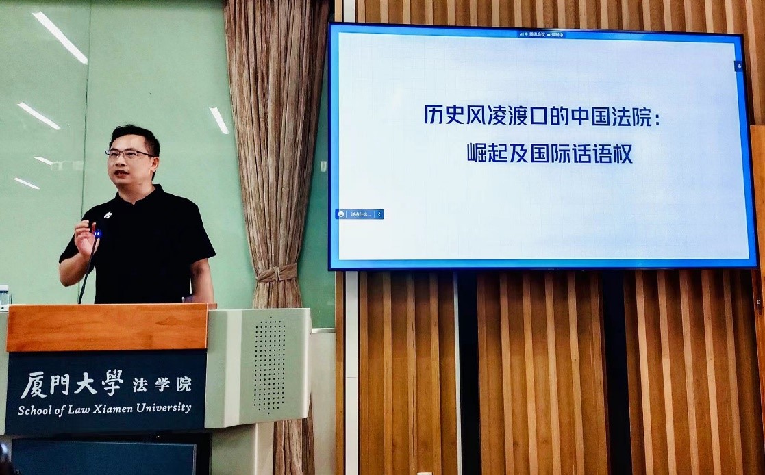 陈延忠法官首先回溯自己在厦门大学法学院学习期间的求学经历和步入法院工作岗位的成长历程,向大家分享如何挖掘兴趣点并形成专业知识储备的诸多心得。他鼓励同学们应该在求学期间放眼世界、博览中西方研究材料的同时,厚植爱国情怀。接着,他结合习近平总书记谈涉外法治人才培养的重要讲话,强调了在“历史风陵渡口”的中国法院的崛起及其国际话语权问题,从而引入此次讲座的主题。